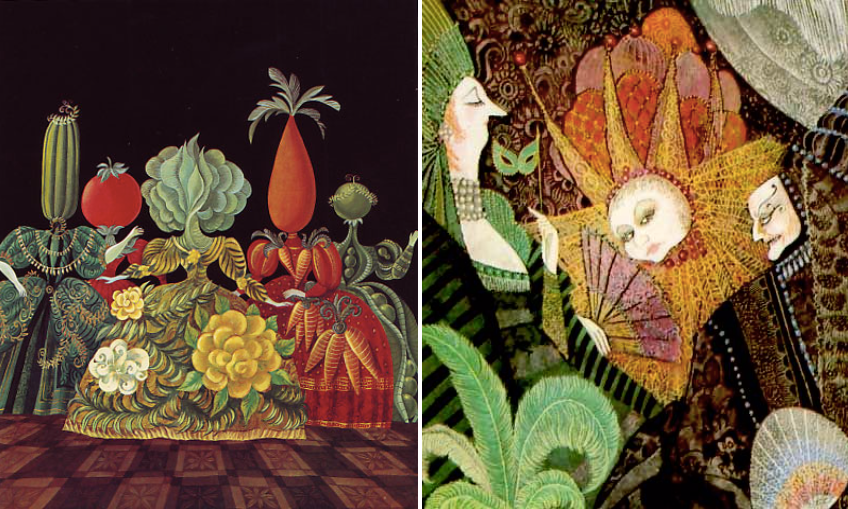 De su biografía me interesó saber que fue franco-canadiense pero nació en Singapur y vivió cinco años en India. En sus ilustraciones veo rasgos de una cultura visual oriental y ornamental, en las tramas, texturas y el decorado de esas telas, trajes, pelucas, plumas, etc. Lo elegí para investigar y escribir porque me llamó la atención el nivel de detalle, la repetición textil, el uso del color, y también el absurdo de algunos personajes como estos que están vestidos de damas antiguas con cabeza de verduras. Algo de este misterio, o quizás parodia, me interesa desarrollar, en mis propios dibujos.
